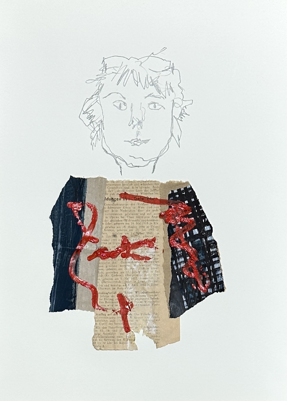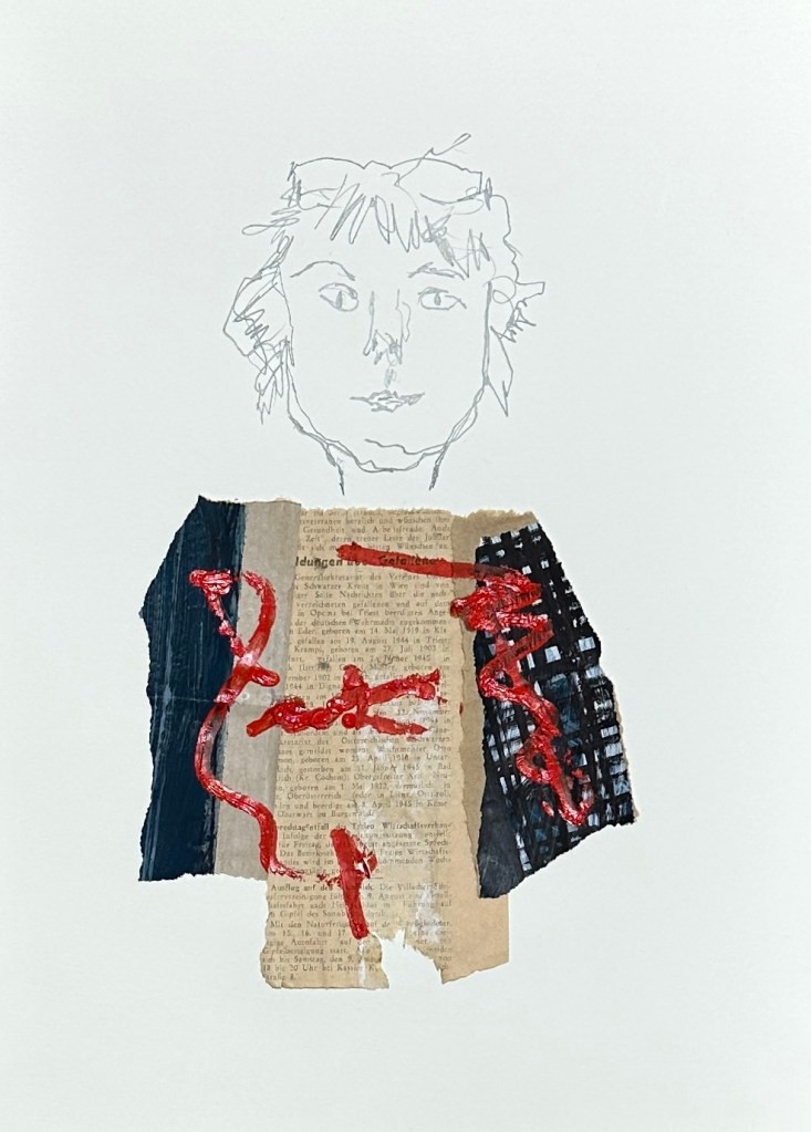 too good to be thrown away | collage 30×40 cmzwischen Himmel und Erde | collage 30×40 cm1947, the house | pencil, oil, acrylic and paper on paper1947, grateful | pencil, oil, acrylic and paper on paper1947, fairy tale | oil, fineliner and paper on paper1947, der Förster | oil, pencil and paper on paperjam session | graphit, oil, acrylic, paper | 30×40 cm upside down | oil, graphit | 30 x 40 cmuntitled | collage 40×30 cmMannequin | collage 40×30 cmout of bed | collage | pencil, paper, oil on paper | 40 x 30 cmuntitled 59 | oil, acrylic on canvas 80 x 60 cmin my dreams | oil on canvas 90 x 70 cmHänsel | acrylic, oil on canvas | 100×80 cm Gretel | acrylic, oil on canvas| | 100×80 cm view on concealed 25 and Hänsel und Gretelconcealed 25a | oil on canvas | 40×50 cm concealed 25b | oil on canvas | 40×50 cmconcealed 25c | oil on canvas | 40×50 cmconcealed 25d | oil on canvas | 40×50 cmuntitled 61 | oil, ballpoint pen, acrylic on canvas | 80 x 100 cmuntitled 62 | acrylic, oil on canvas | 150 x 120 cm